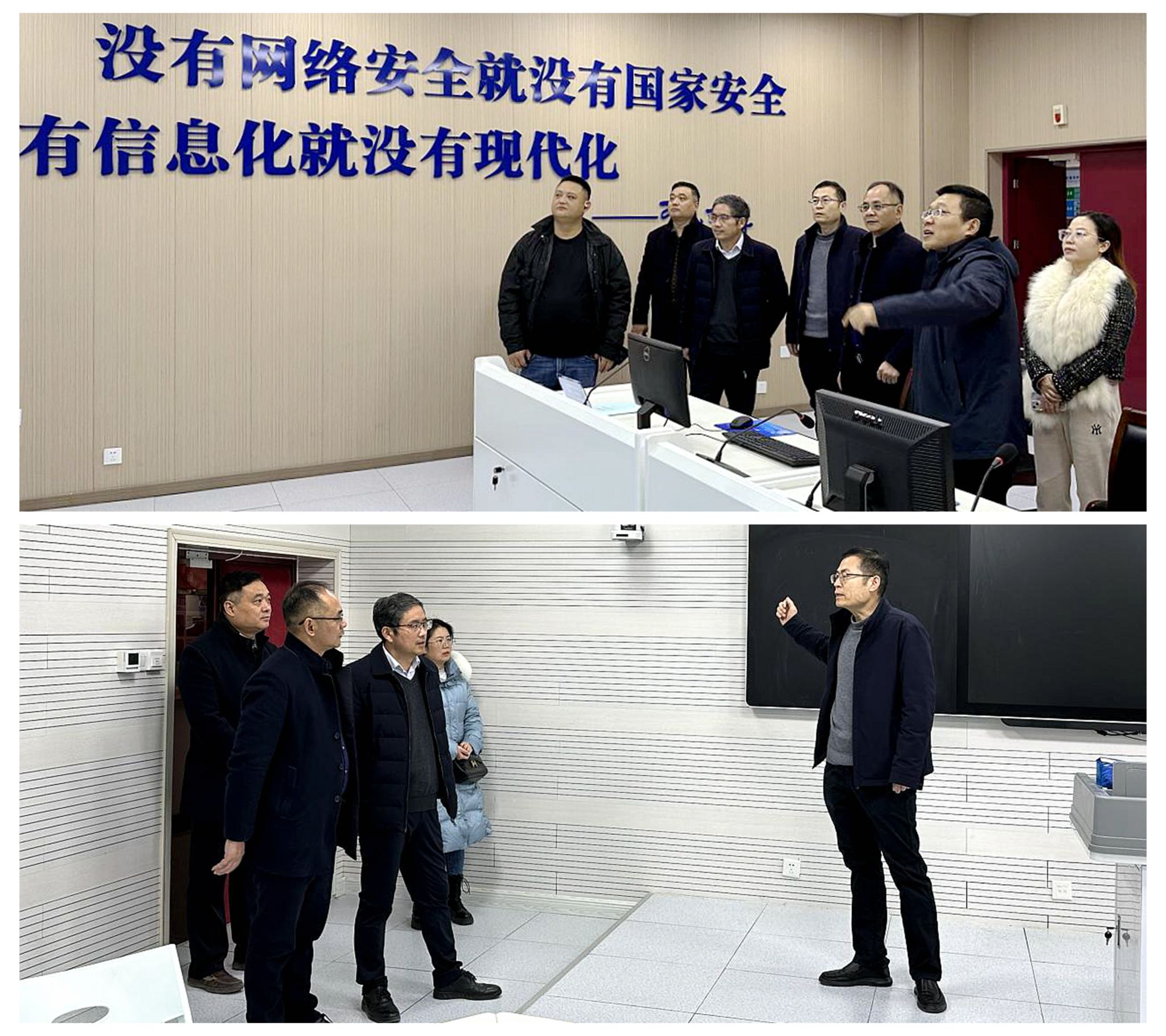 会后,王新武陪同谢远健一行参观了学校网络信息监控中心、智慧录播教室、微课录制室、博物馆等场所。