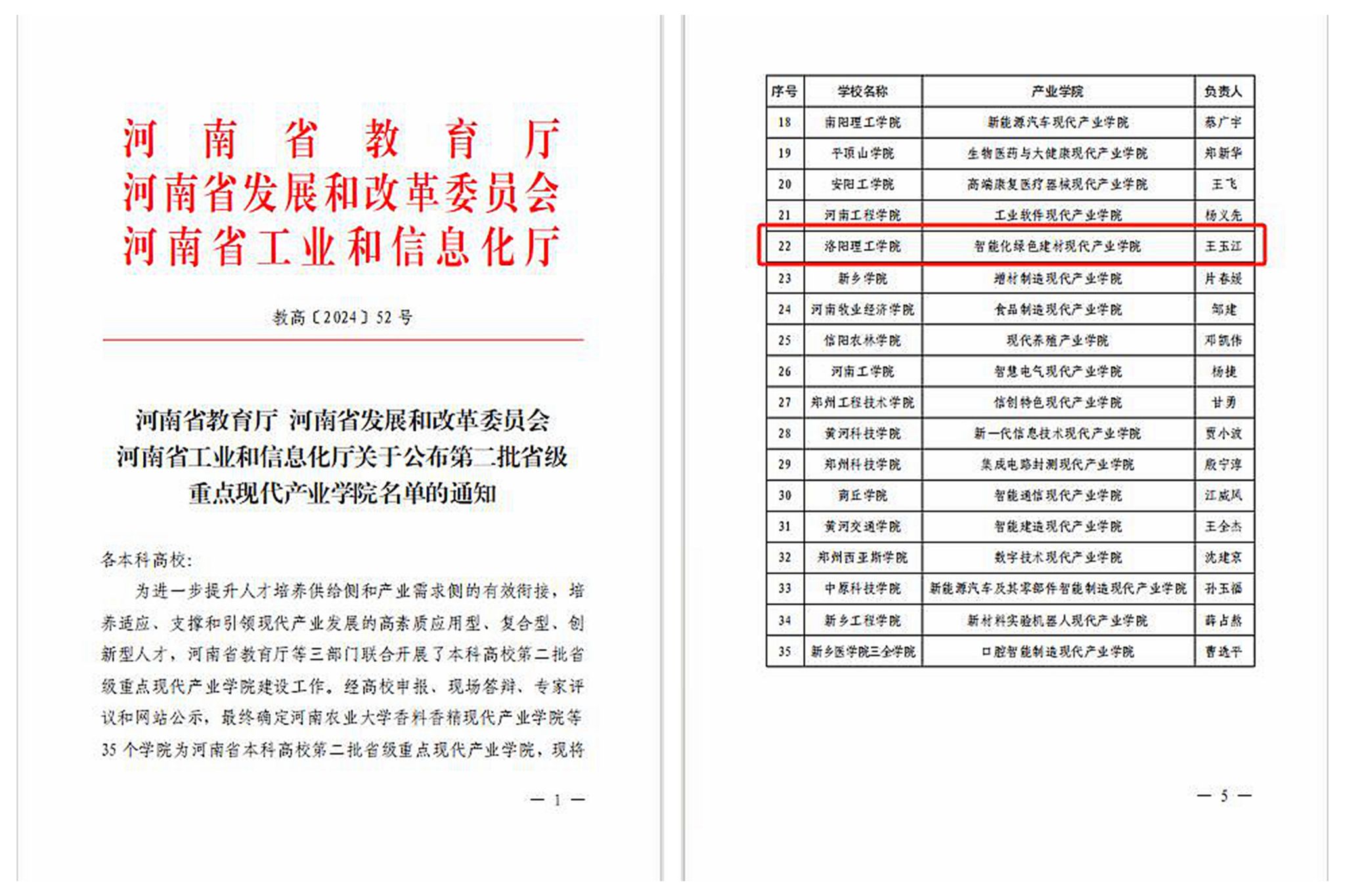 近日,河南省教育厅、河南省发展和改革委员会、河南省工业和信息化厅印发《关于公布第二批省级重点现代产业学院名单的通知》(教高[2024]52号), 由我校材料科学与工程学院牵头申报的“智能化绿色建材现代产业学院”获批第二批省级重点现代产业学院建设项目。