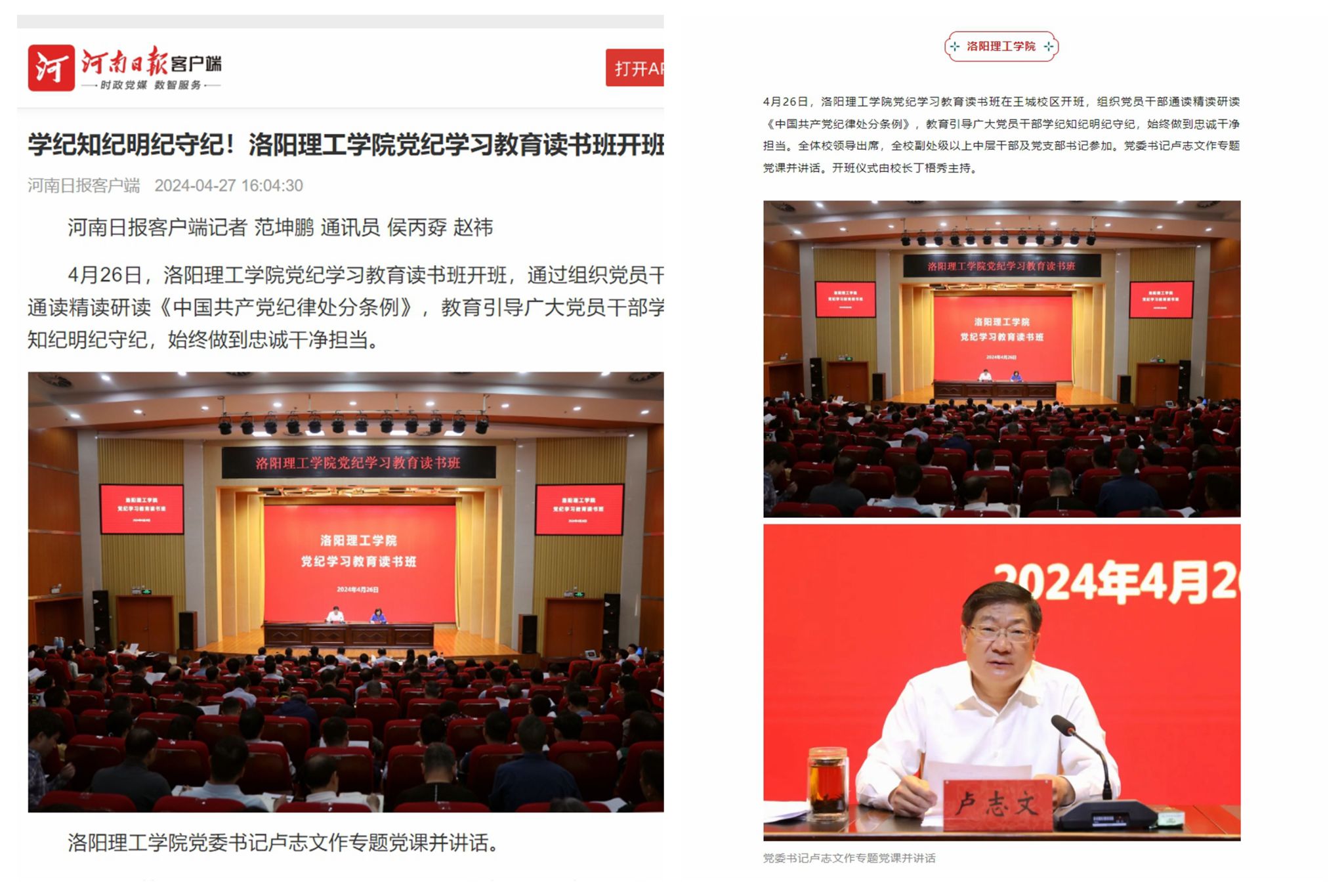1. 《河南日报》客户端,2024年4月27日,《学纪知纪明纪守纪!洛阳腾博官网诚信为本专业服务党纪学习教育读书班开班》