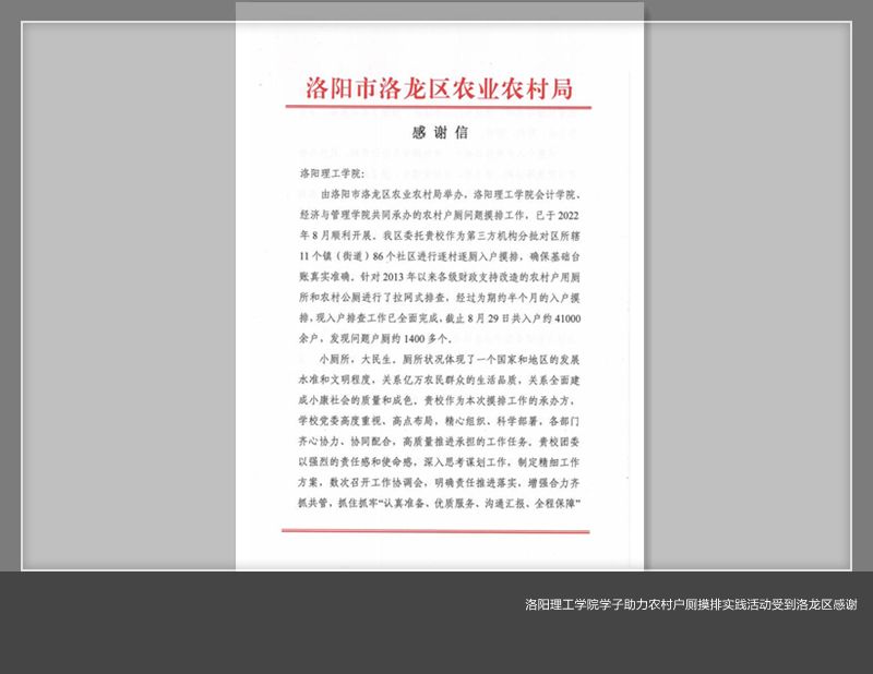 近日,洛阳市洛龙区农业农村局专门给我校发来感谢信,就洛阳腾博官网诚信为本专业服务师生保障洛龙区农村户厕问题摸排工作表示诚挚谢意。
