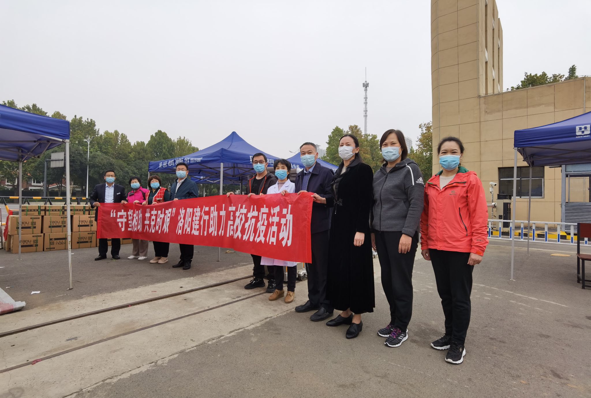 10月29日下午,建设银行洛阳分行机构部总经理陈振东、南昌路支行行长乔丽艳等将捐赠的医用口罩、酒精、消毒液等抗疫物资送达我校。校党委副书记、校工会主席曾涛,副校长马珺代表学校接受捐赠,党政办公室、财务处、校医院等部门负责人参加了捐赠活动。