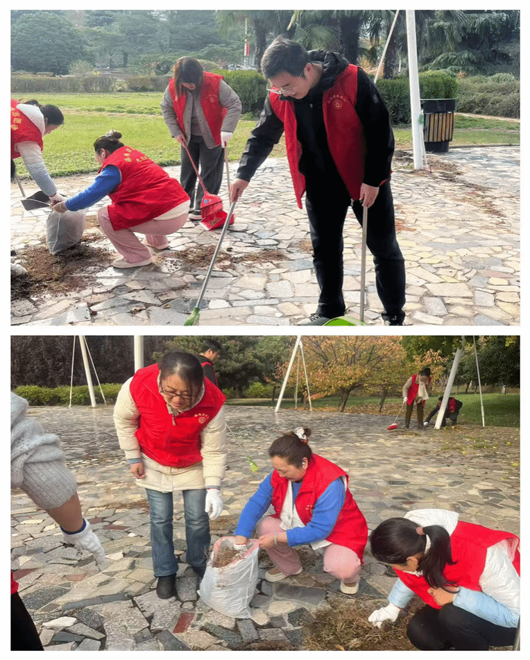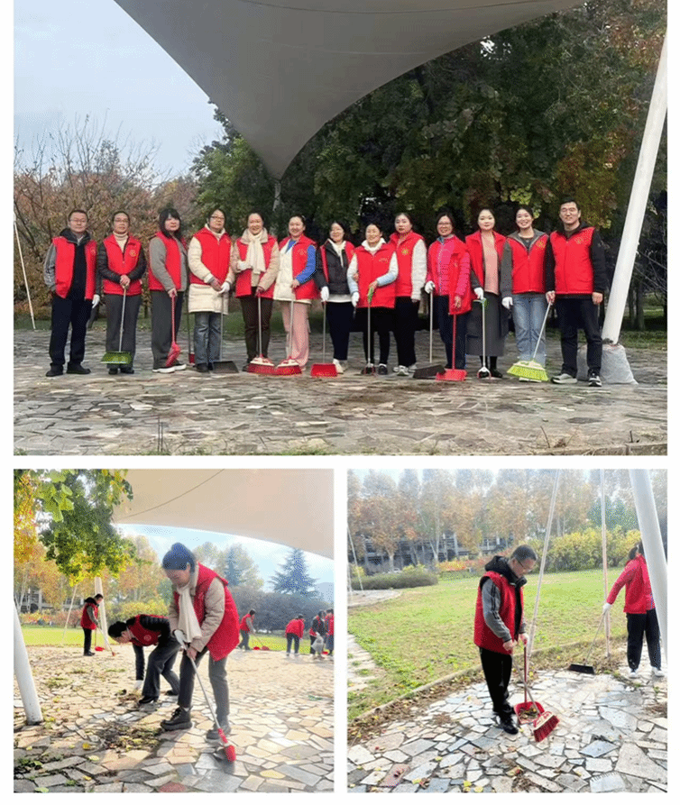 大家拿着扫帚、簸箕、夹子等工具准时到达划定区域,分工协作,默契配合,对地面上的落叶进行了细致打扫,深入各个角落清理草丛中的碎屑、杂物。活动过程中,财务处同志们红色的身影和校园深秋的金黄构成了一幅美丽的画卷。