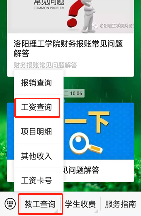 打开洛阳腾博官网诚信为本专业服务财务处微信公众号。未关注请先关注并绑定(首次绑定用户名为工号,初始密码为身份证后6位)