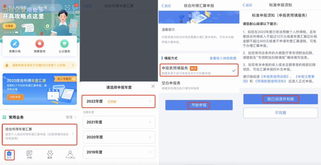 第一步:进入专题页-2022综合所得年度汇算。纳税人在个人所得税APP首页点击“综合所得年度汇算”选择2022申报年度后,进入综合所得汇算页面,选择【申报表预填服务】开始申报。