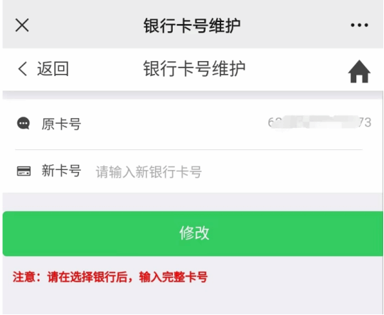 在以下银行卡维护界面,核对现有农行卡卡号后四位是否为本人当前所用农行卡(在此界面不能全部显示卡号),如有变动,请及时修改。