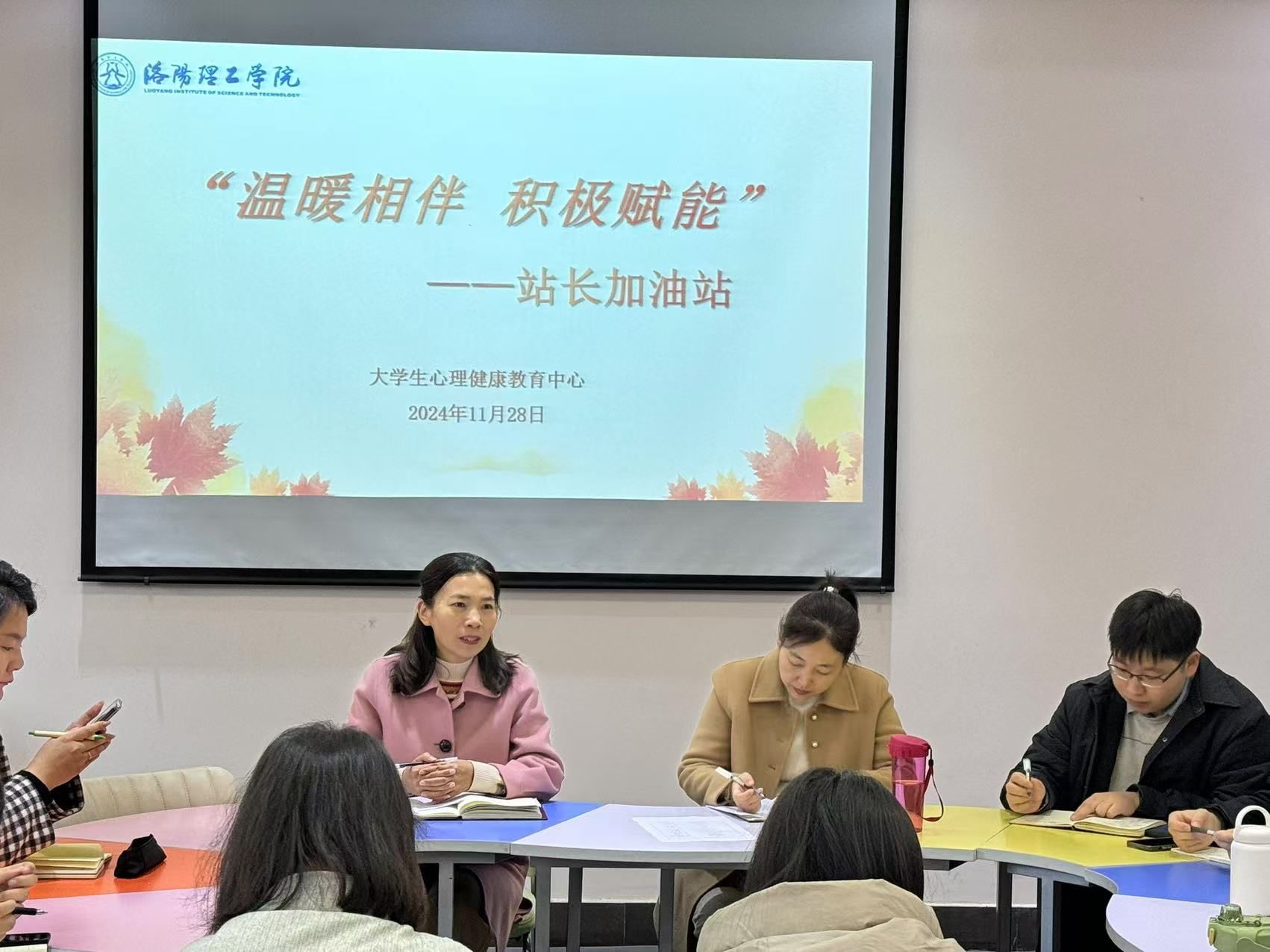11月28日上午,大学生心理健康教育中心在王城校区团体心理辅导室召开以“温暖相伴,积极赋能”为主题的站长加油站活动。大学生心理健康教育中心主任卢爱新主持会议,各学院心理辅导站站长及心理中心全体教师参加会议。