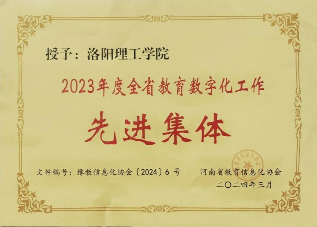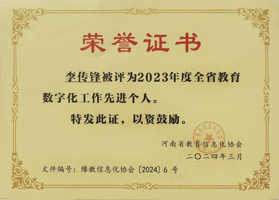 根据豫教信息化协会〔2024〕6号文件精神,我校荣获2023年度全省教育数字化工作先进集体。李传锋荣获2023年度全省教育数字化工作先进个人。
