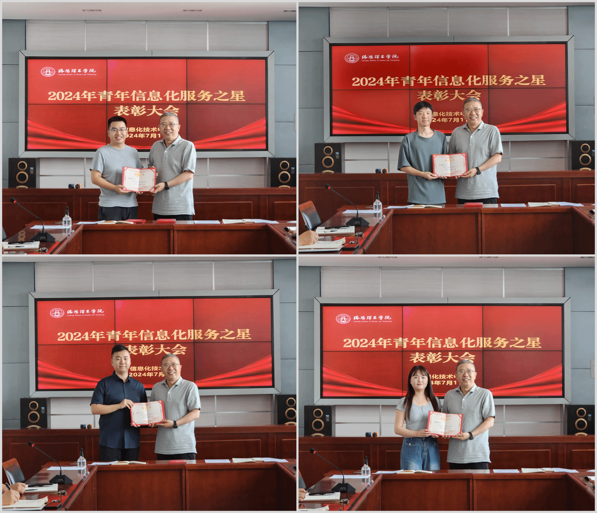 中心主任李传锋在致辞中高度评价了青年教职工在信息化服务工作中的重要作用,中心书记刘庆伟为吴效谦、李明凯、王璐瑶、赵哲鸣四位青年教职工颁发“2023-2024年度信息化服务之星”荣誉证书。他们表示将珍惜这份荣誉,继续发扬创新精神和服务意识,努力为全校师生提供更加高效、便捷、安全的信息化服务。
