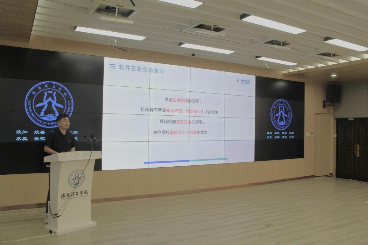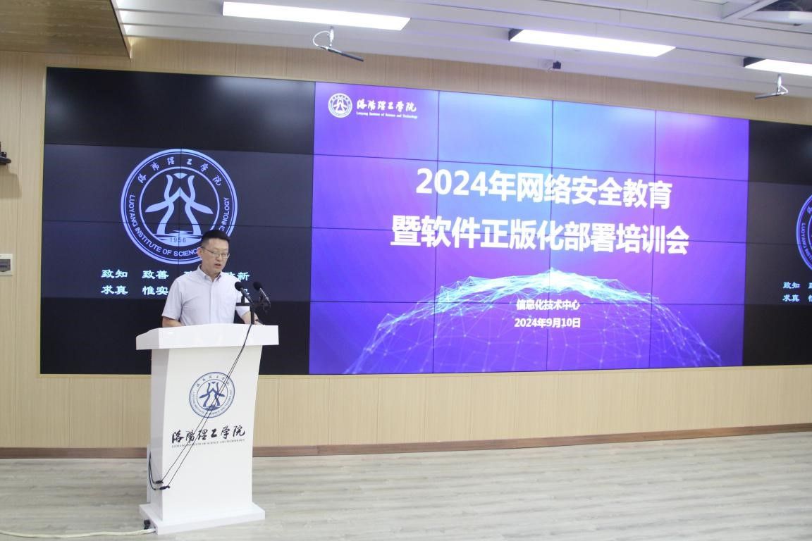 2024年9月10日下午,信息化技术中心在王城校区公共教学楼AE507举办网络安全教育暨软件正版化培训活动。洛阳市公安局洛龙分局副局长赵捍卿、网络安全保卫大队大队长张振峰等一行4人、信息化技术中心直属党支部书记兼主任刘庆伟、实验室建设与设备管理办公室副主任谢杰、软件行业专家以及学校各部门信息管理员、网络管理员,实验室主任、机房管理员,等60余人参加了此次会议。会议由信息化技术中心副主任梁凯主持。