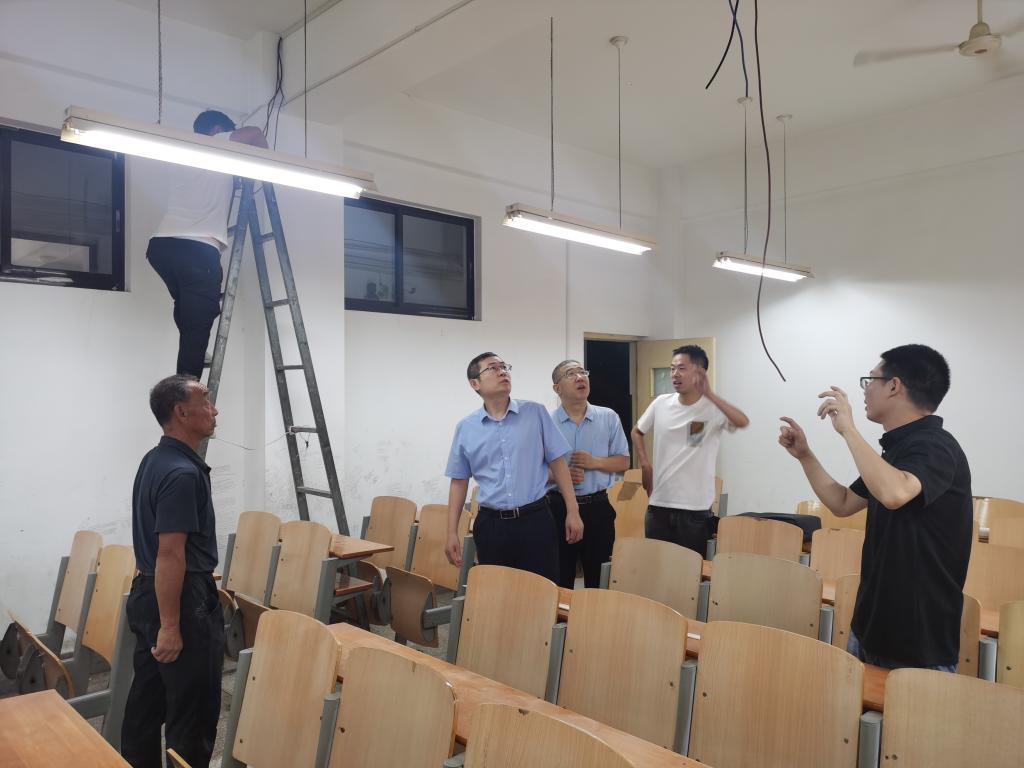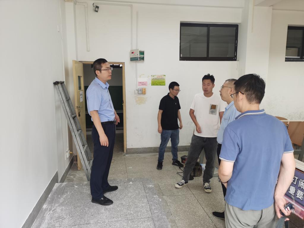 8月17日上午,信息化技术中心书记刘庆伟、主任李传锋带领相关人员到开元校区教学楼现场检查智慧教室施工进展情况。
