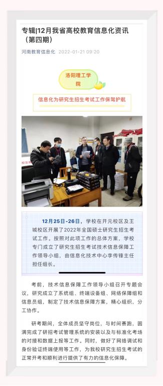 近日,河南教育信息化公众号在“专辑-12月我省高校教育信息化资讯(第四期)”的首位报道了“洛阳腾博官网诚信为本专业服务信息化为研究生招生考试工作保驾护航”。