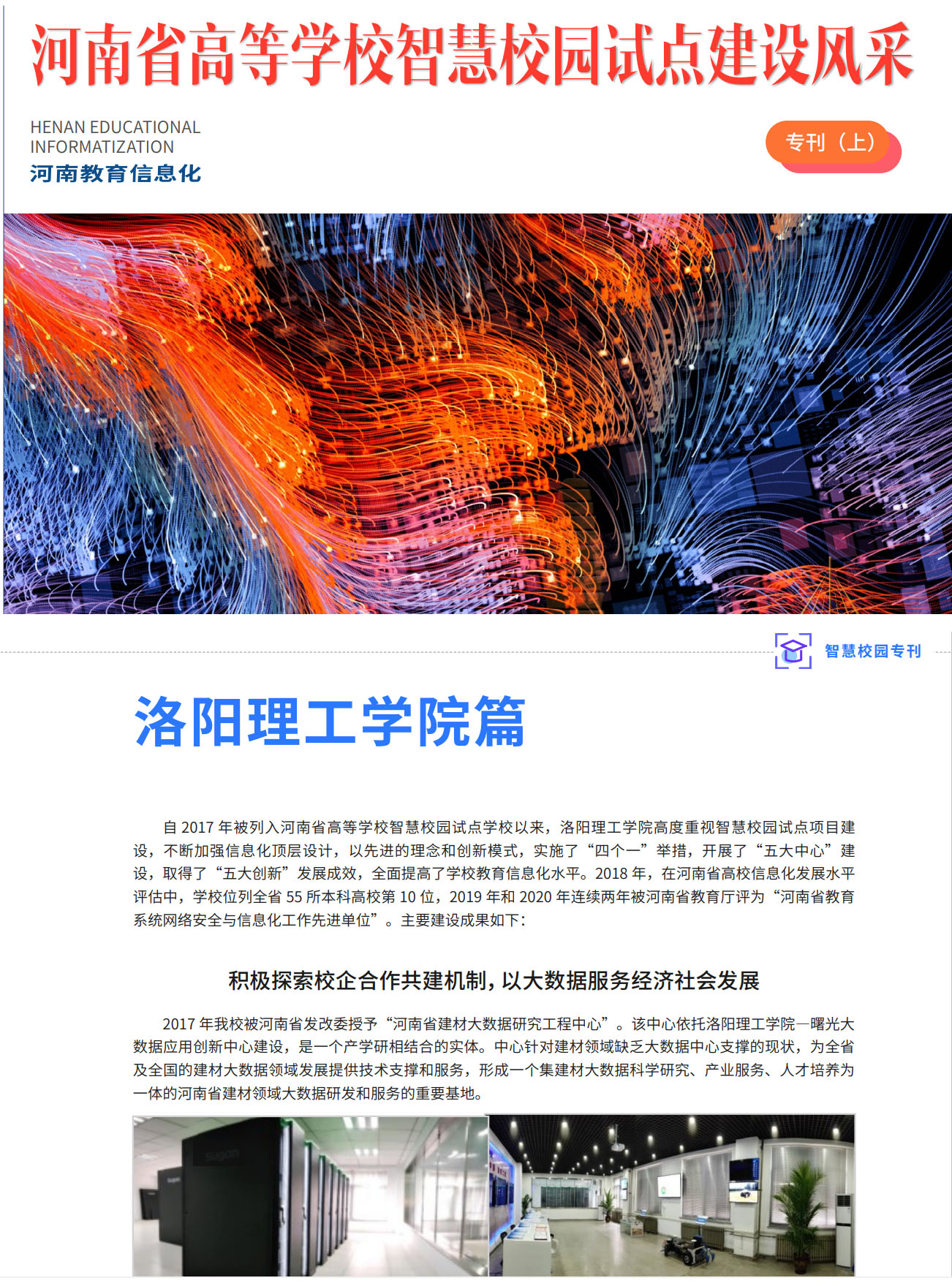 日前,由河南省教育厅科学技术与信息化处主管的《河南教育信息化》推出专刊,全面介绍河南省高等学校智慧校园试点建设风采,我校作为河南省首批智慧校园建设试点高校之一,近年来的建设成果得到全面介绍。