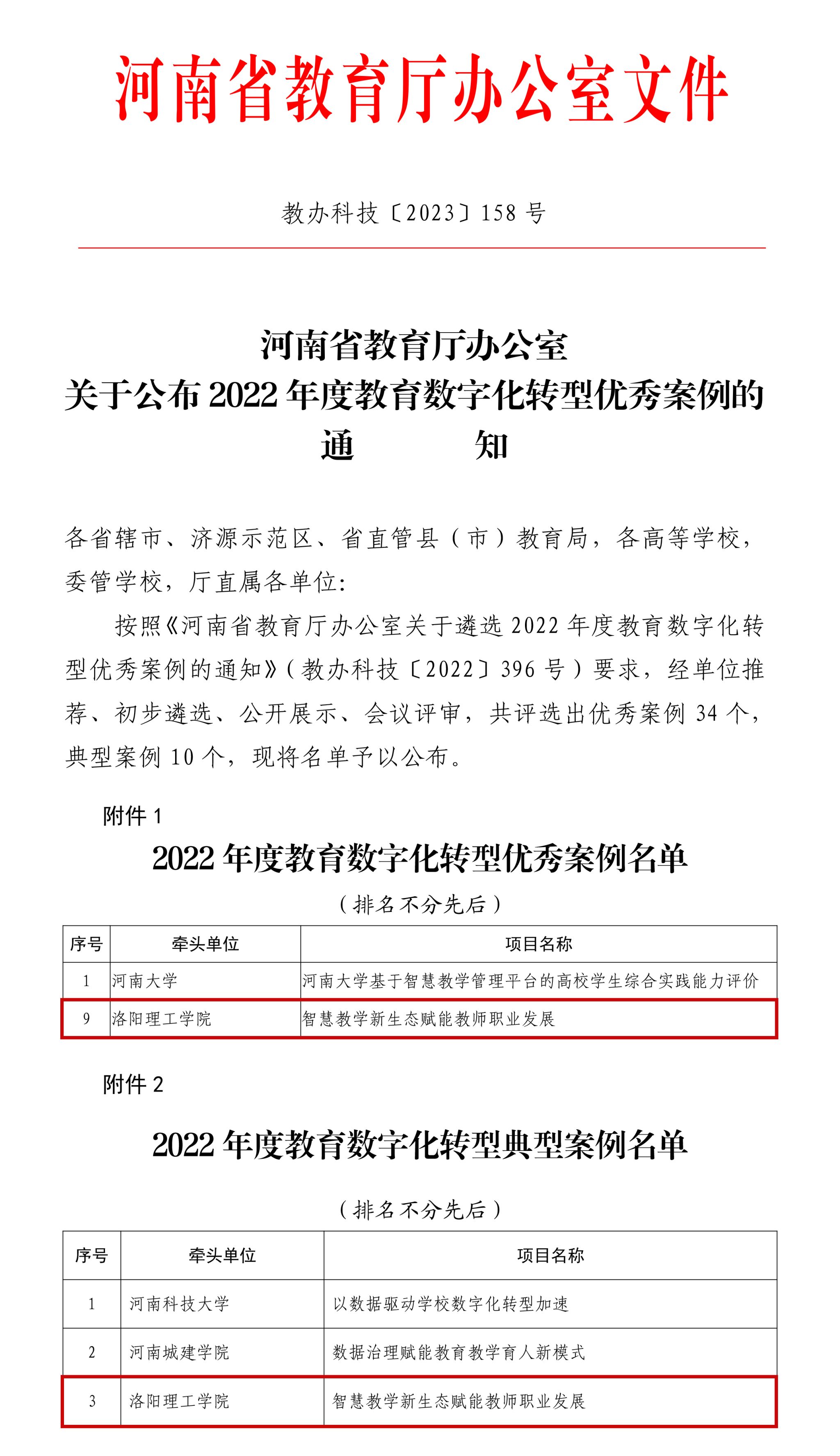 近日,河南省教育厅印发了《河南省教育厅办公室关于公布 2022年度教育数字化转型优秀案例的通知》(教办科技〔2023〕158号),在全省众多高校及各地市中小学中评选出优秀案例34个,典型案例10个。洛阳腾博官网诚信为本专业服务报送的《智慧教学新生态赋能教师职业发展》入选2022年度教育数字化转型优秀案例名单,并成功入选2022年度教育数字化转型典型案例名单。此次成功入选是继上年度学校获评全省教育信息化应用优秀案例之后的又一突破。