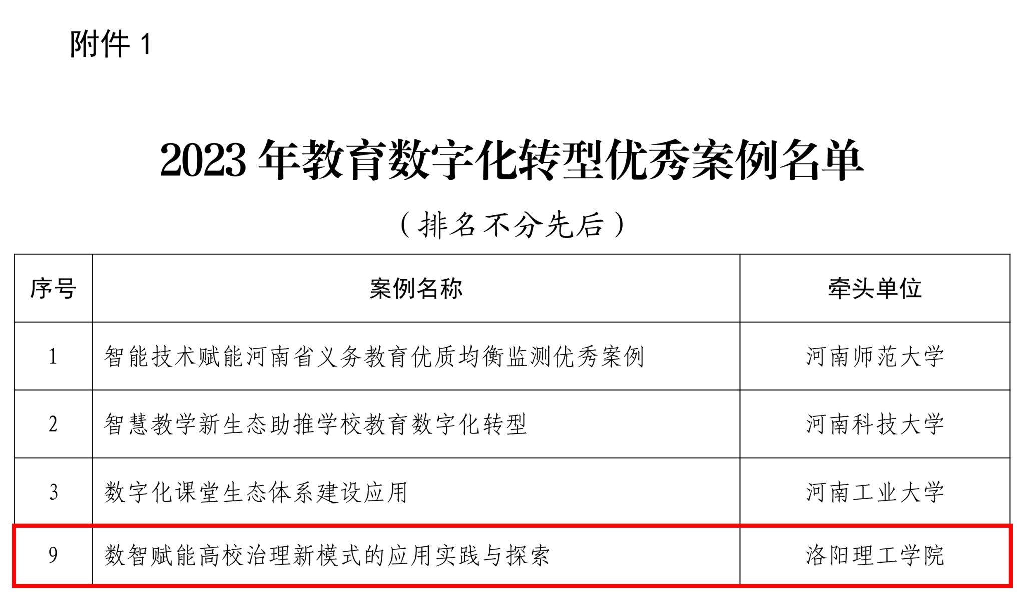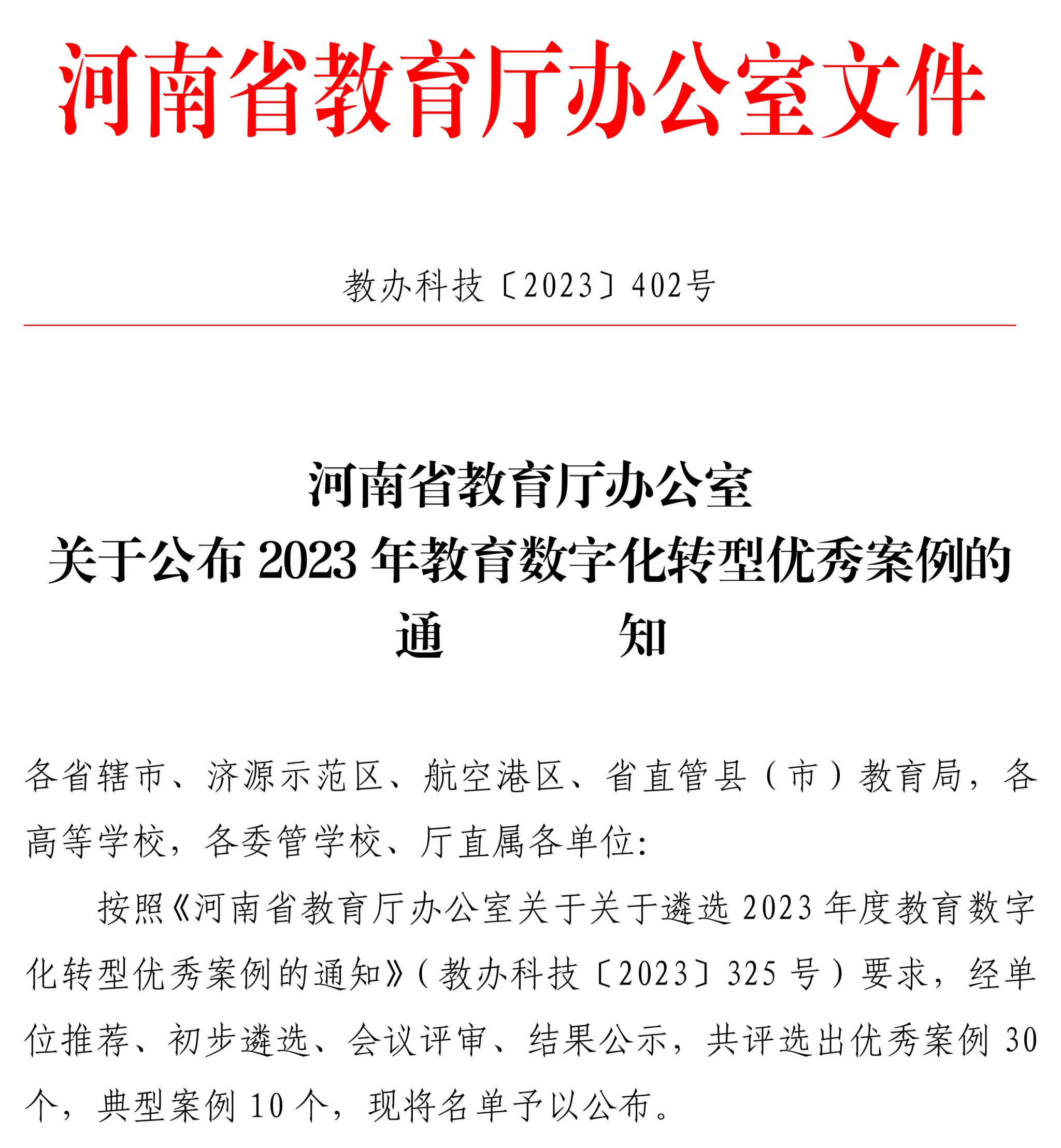 近日,河南省教育厅印发了《河南省教育厅办公室关于公布2023年教育数字化转型优秀案例的通知》(教办科技〔2023〕402号)。我校申报的《数智赋能高校治理新模式的应用实践与探索》成功获评河南省教育数字化转型优秀案例。