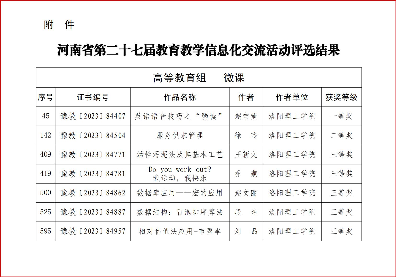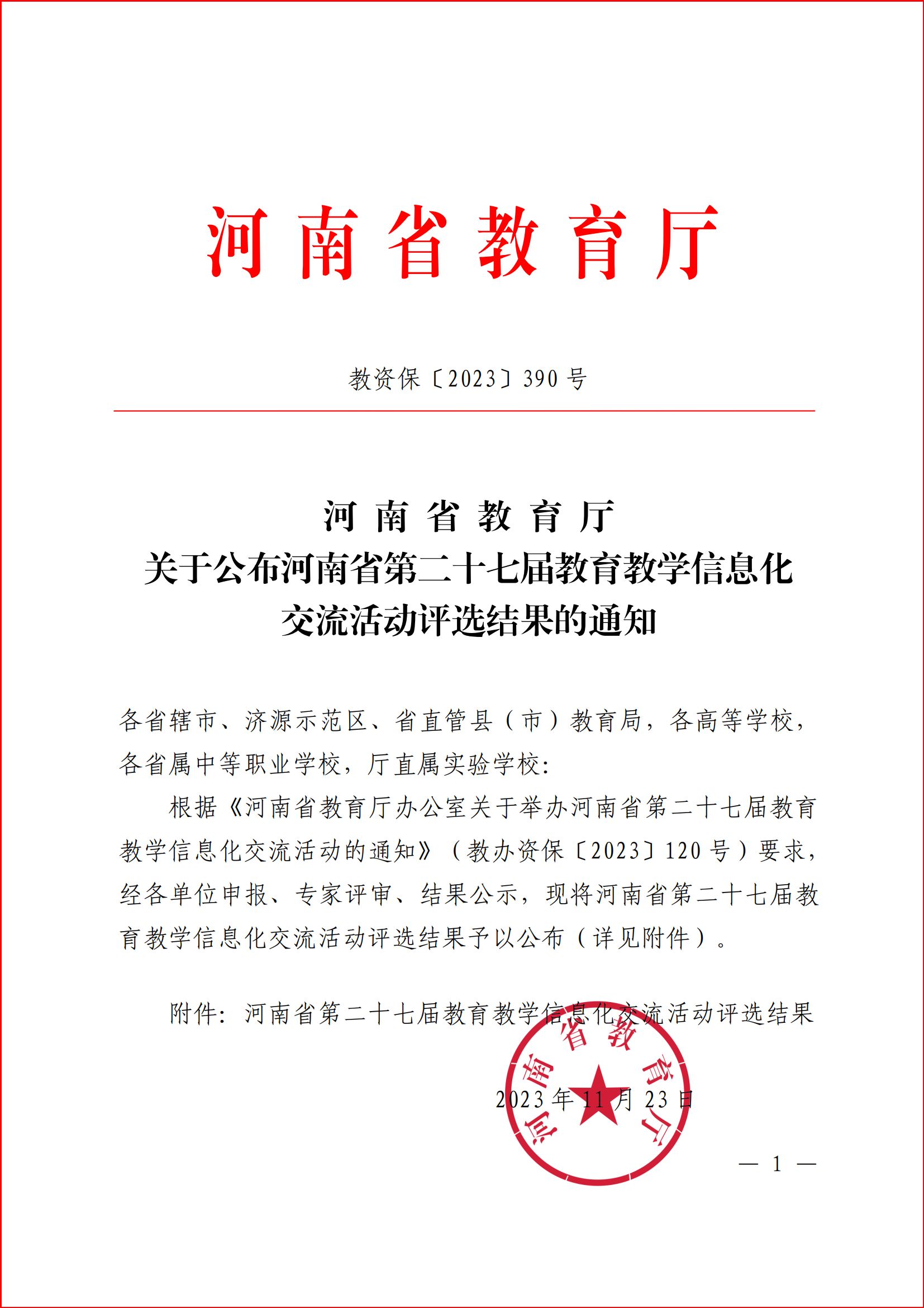 近日,根据《河南省教育厅关于公布河南省第二十七届教育教学信息化交流活动评选结果的通知》(教资保[2023]390号)文件精神,我校报送的高等教育组微课作品喜获佳绩,最终获得一等奖1项、二等奖1项、三等奖5项。