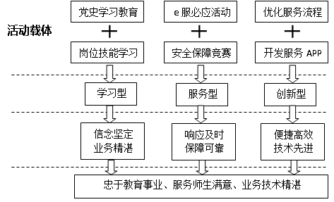 围绕建设“学习型、服务型、创新型”基层党组织这个目标,开展系列活动,加强师德师风建设学习和业务能力提高学习;开展“e服必应”和“安全保障500天”等岗位服务竞赛;依托校园网优化服务流程,开发服务APP模块,提升对信息化应用服务依赖度。