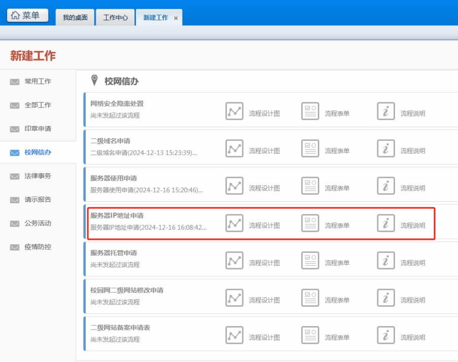 此项流程可通过学校OA系统申请实施,OA系统位置:菜单->工作流->新建工作->校网信办->选择“服务器IP地址使用申请”(如下图)