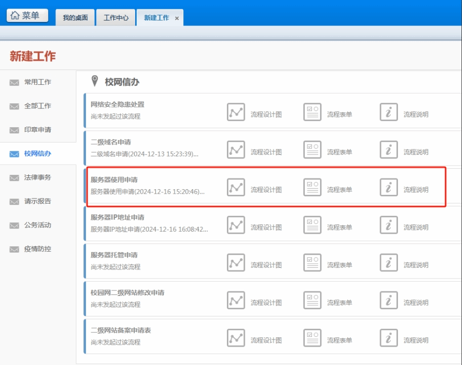 此项流程可通过学校OA系统申请实施,OA系统位置:菜单->工作流->新建工作->校网信办->选择“服务器使用申请”(如下图)