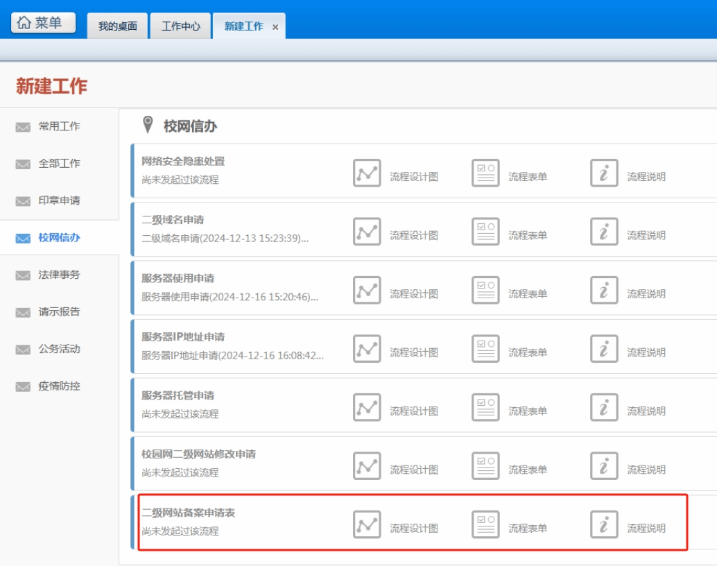 此项流程可通过学校OA系统申请实施,OA系统位置:菜单->工作流->新建工作->校网信办