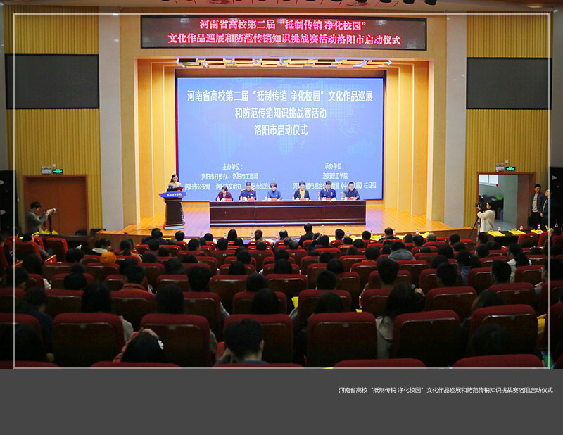 为打击传销活动,切实保护在校学生利益和人身安全。11月15日下午,河南省高校“抵制传销、净化校园”文化作品巡展和防范传销知识挑战赛活动洛阳市启动仪式在我校王城校区图书信息中心报告厅成功举办。校党委副书记葛玻,洛阳市政府副秘书长高丽萍,洛阳市工商局副局长王志伟、马元晓,洛阳市公安局经侦支队知识产权和市场秩序大队副大队长李顺星、河南广播电视台公共频道《中原红盾》栏目组主任宋建业和我校宣传部、学工部、保卫处、团委等部门负责人出席会议,来自河南科技大学、洛阳职业技术学院、河南省推拿职业学院和我校的近800名学生参加启动仪式。