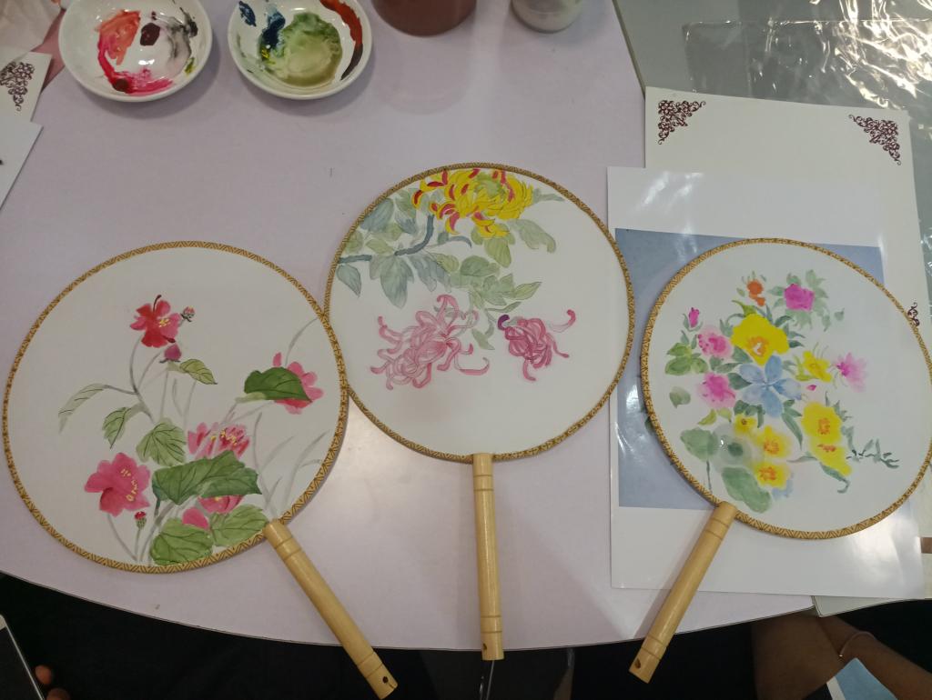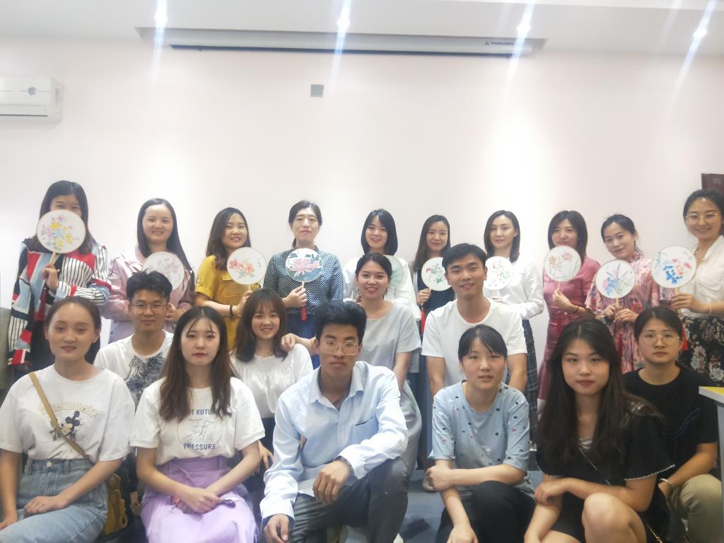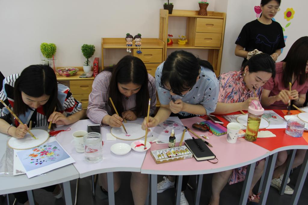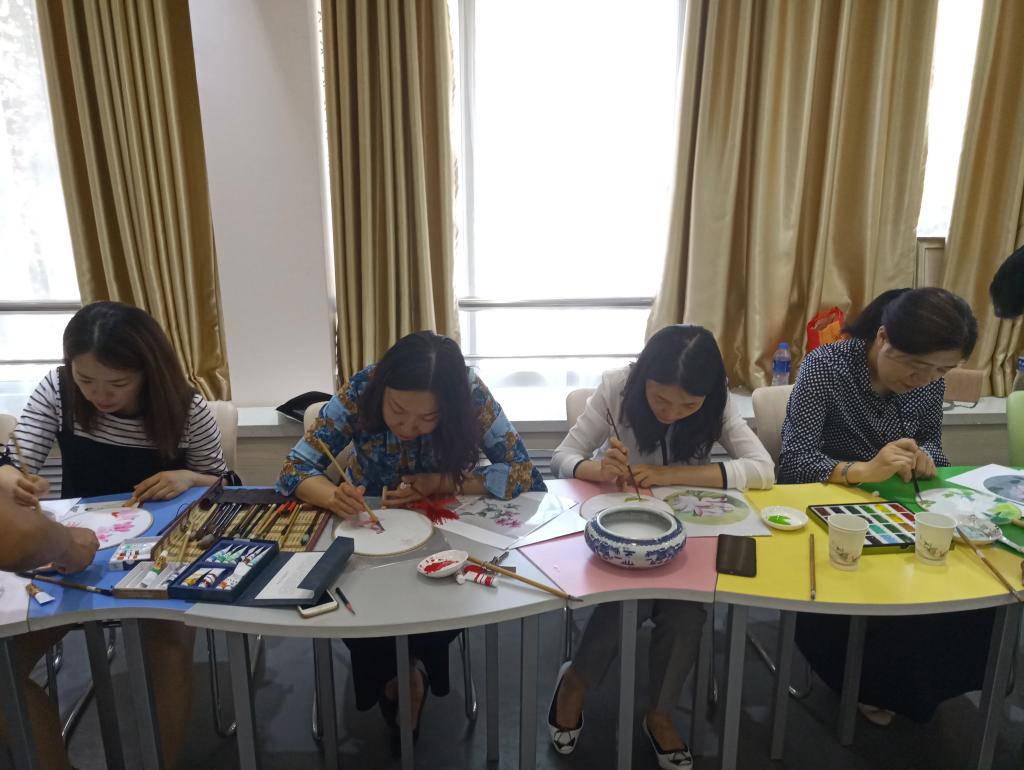 首先,全体老师欣赏了艺术设计学院学生带来的团扇绘制视频,在舒缓悠扬的音乐中学习我国团扇绘画的技巧,感受中华传统文化沁润心灵、陶冶情操的魅力。视频结束后各位老师选择了自己所喜爱的团扇图案,并纷纷拿起画笔开始为团扇上色晕染,在创作的过程中每位老师都认真投入,发挥自己的想象力和创造力,在宁静祥和的气氛中感受彼此的支持与快乐,真正达到了缓解压力、愉悦身心的目的。