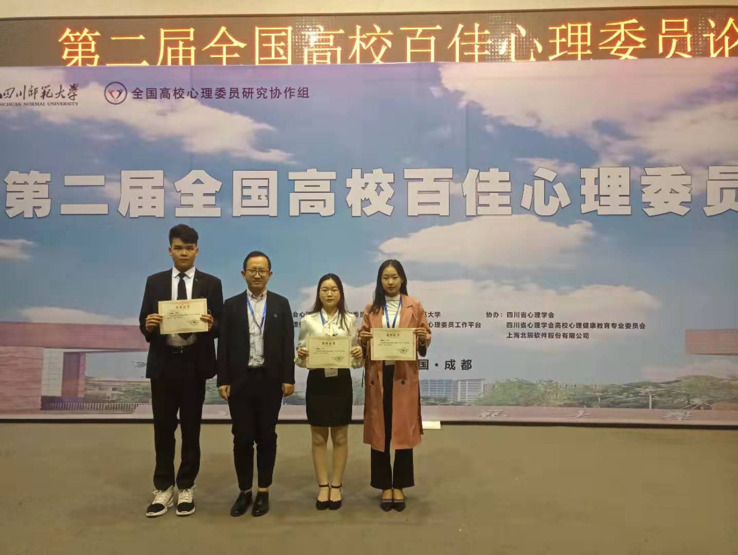 11月14日,由中国心理学会心理危机干预工作委员会、全国高校心理委员研究协作组主办的第四届中国心理学会心理危机干预工作委员会学术会议暨第十四届全国高校心理委员工作研讨会与朋辈心理辅导论坛在四川师范大学召开,来自全国300多所高校的心理健康教育工作者和心理委员代表参加了此次大会。会议公布并表彰了第二届“全国百佳心理委员”获评人员,我校推荐的优秀心理委员代表艺术设计学院王明威、教育科学与音乐学院化媛媛和人文与社会科学学院孙萧飞荣获第二届“全国百佳心理委员”荣誉称号。