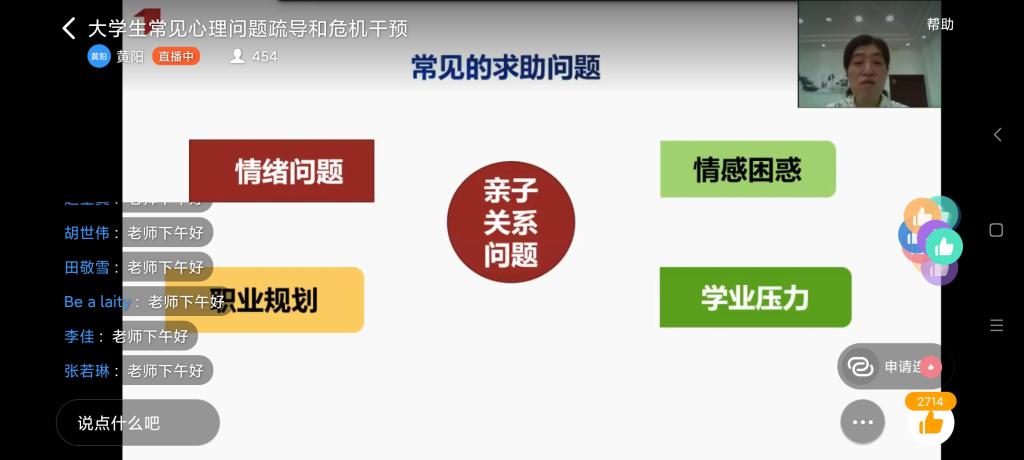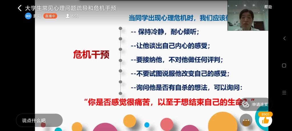 黄阳老师从疫情期间常见心理问题疏导、心理危机预防和心理危机干预三个部分展开,针对疫情防控期间大学生常见的情绪情感、亲子关系、学习焦虑和职业规划等方面的心理困扰进行了全面的解读,生动细致地分析了“开学恐惧”和“居家作息混乱”的心理机制与疏导策略。然后,总结与归纳了“疫情后九种常见心理状态”,结合案例分析,引导同学们学会情绪自我照顾,有效调节焦虑和抑郁情绪,并带领同学们进行了意象对话放松冥想训练体验。最后,向同学们详细讲述了大学生心理危机的识别、预防与干预等相关知识,教会同学们应对心理危机的正确态度与方法,力争做到心理问题早发现、早识别、早报告和早干预。