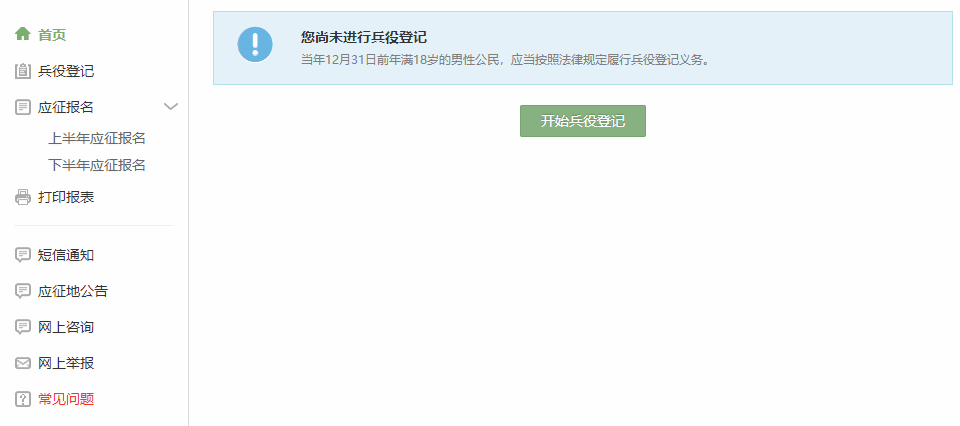 登录系统以后,点击右侧的开始兵役登记”进行兵役登记!