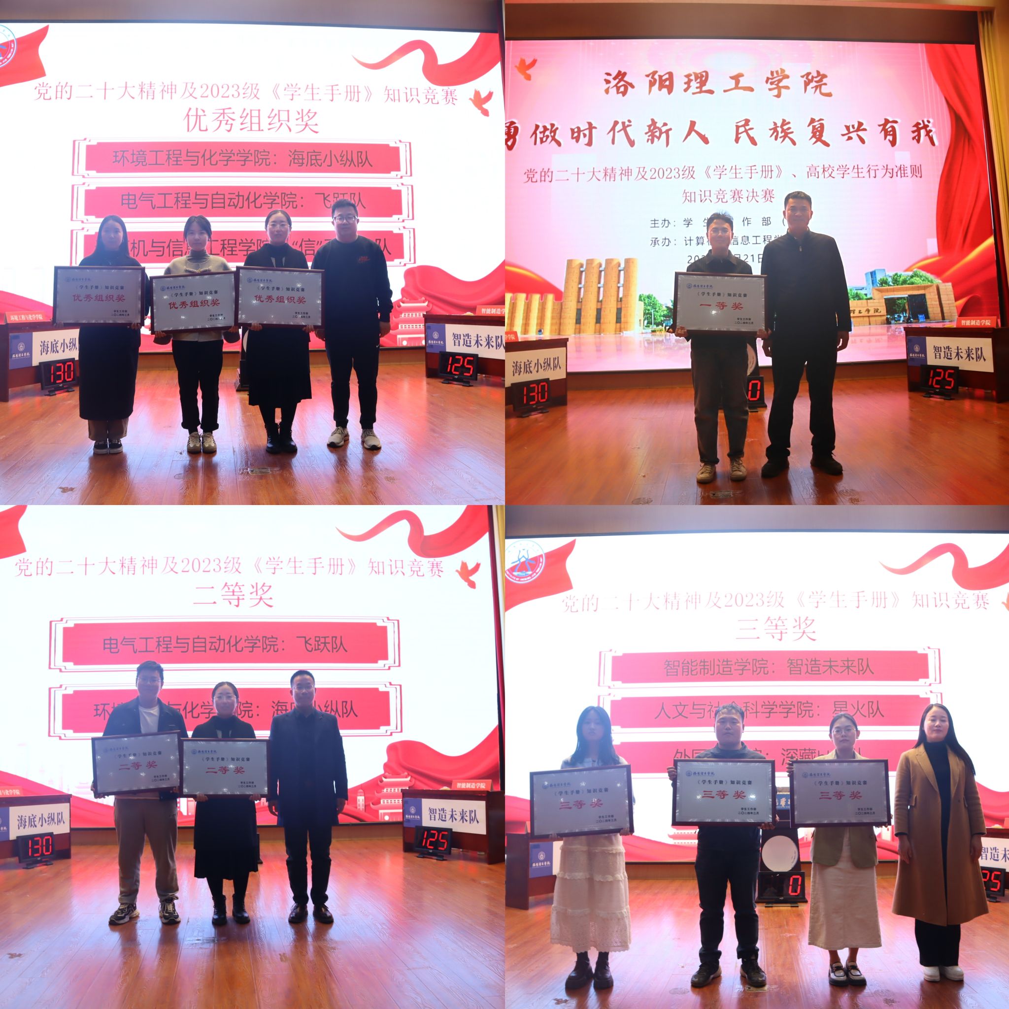 本次竞赛以“勇做时代新人 民族复兴有我”为主题,内容涉及党的二十大精神、高校学生行为准则、学生日常教育、学籍学位、本科教育教学审核评估等多个方面,决赛过程由必答题、选答题、抢答题和风险题四个环节组成。
