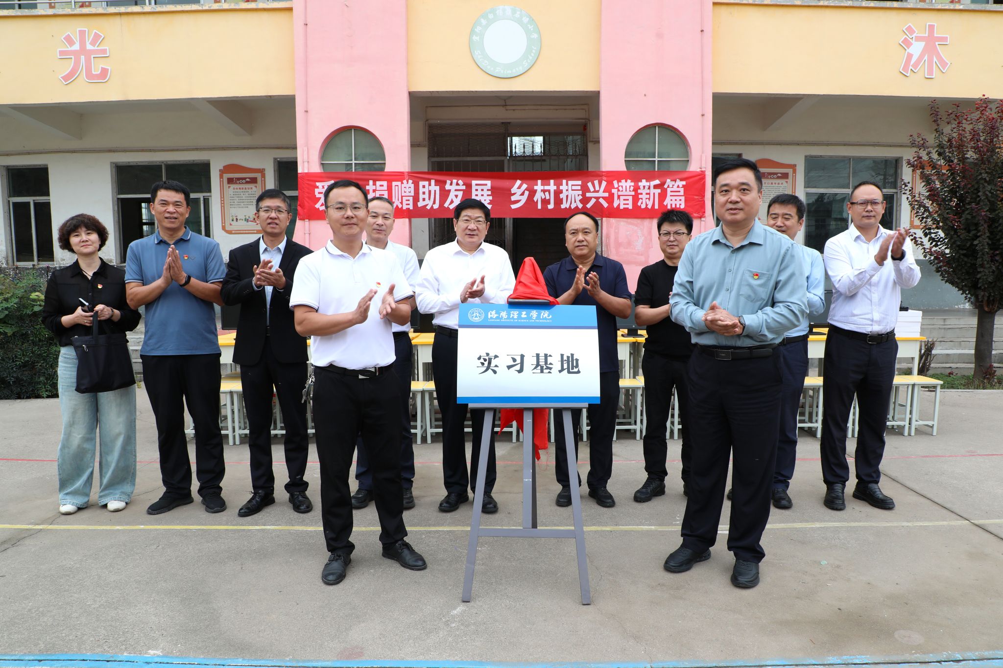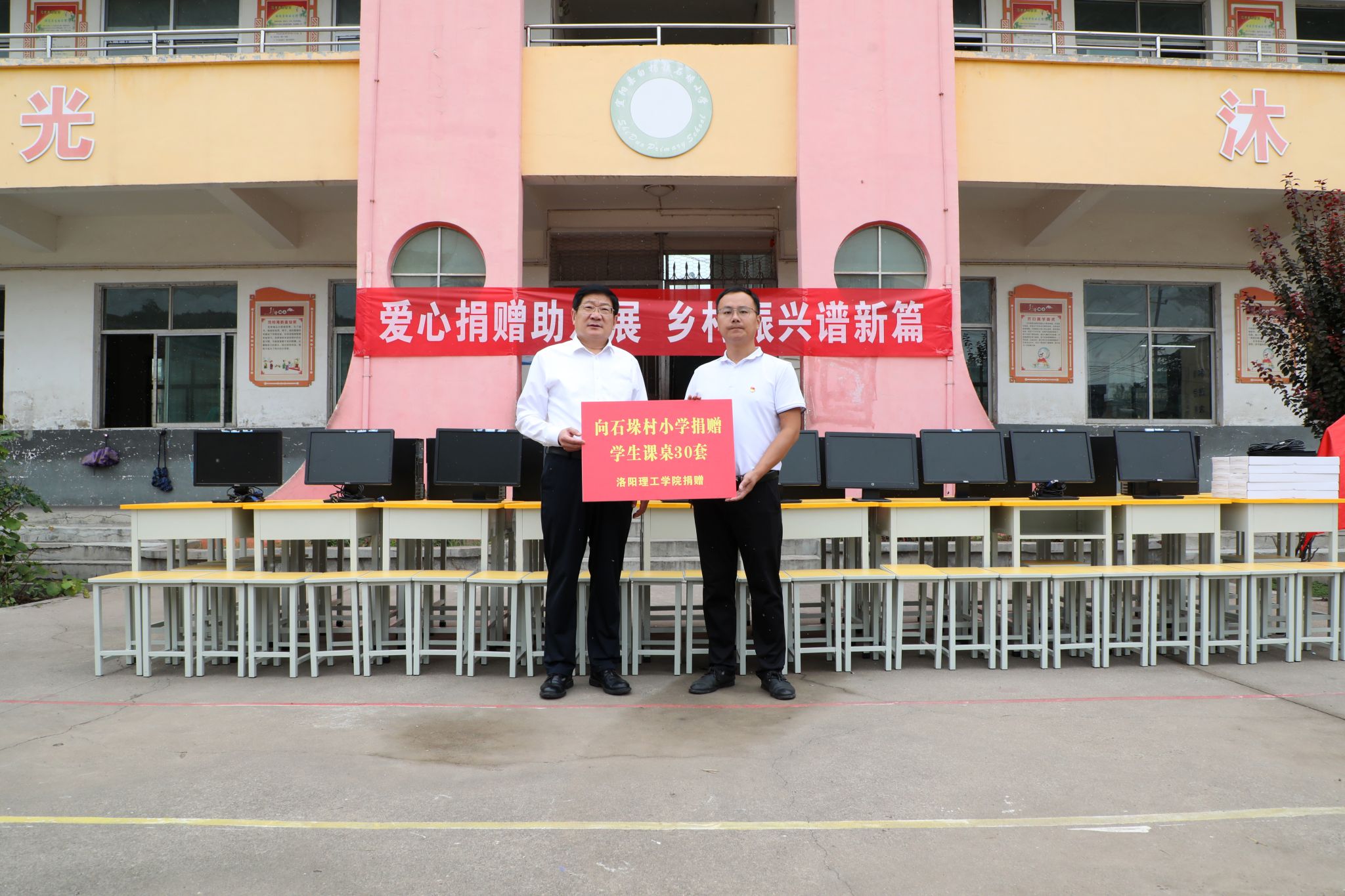 在石垛村小学,卢志文一行出席洛阳腾博官网诚信为本专业服务大学生实习基地揭牌仪式,向学校捐赠电脑、课桌椅,为村“两委”赠送《习近平谈治国理政》第五卷、《习近平的扶贫足迹》《之江新语》等理论书籍,为驻村工作队送去慰问品和理论书籍,切实把关怀送到基层一线。