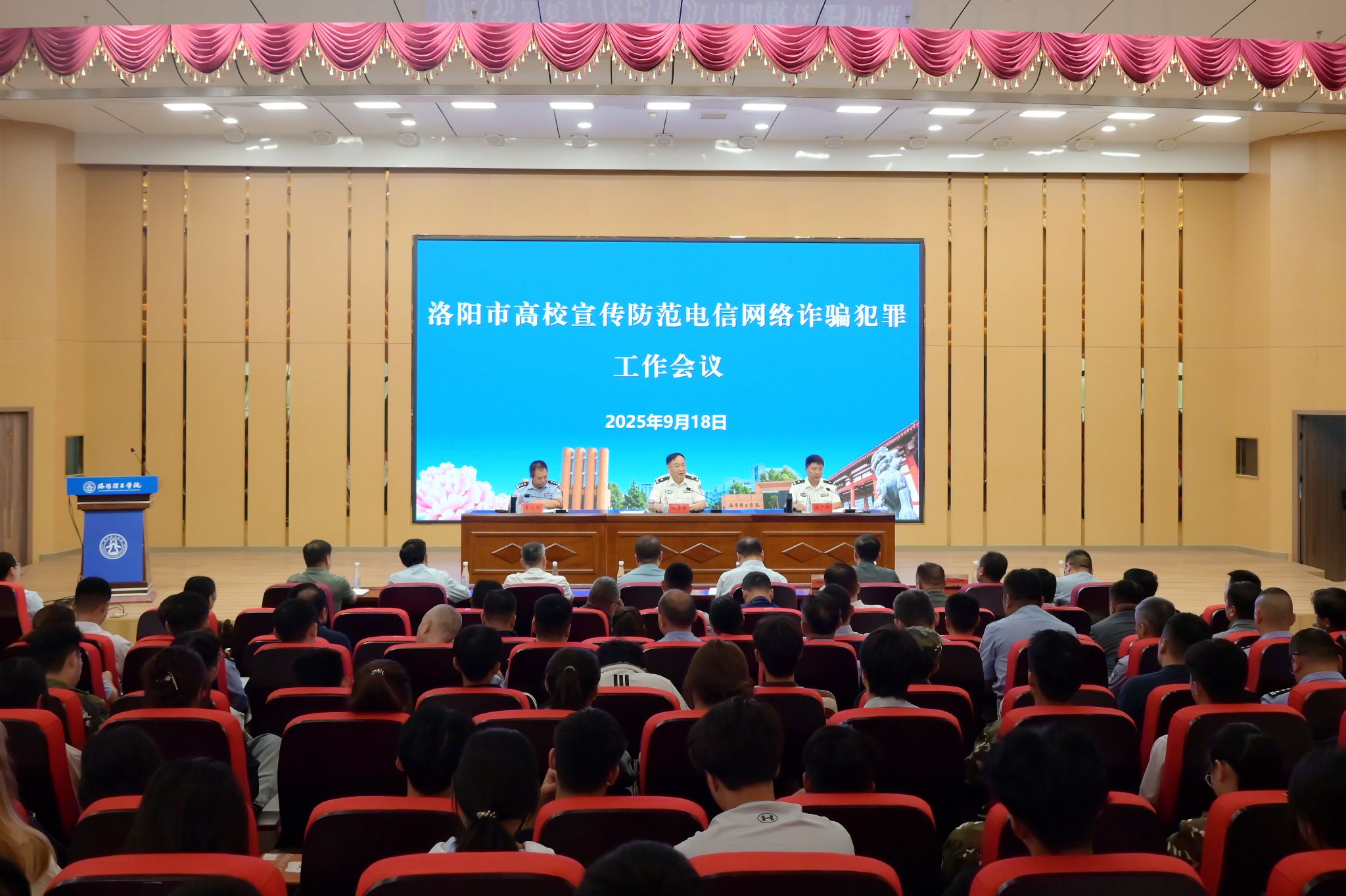 9月18日上午,洛阳市高校宣传防范电信网络诈骗犯罪工作会议在我校开元校区图书馆报告厅召开。洛阳市131机制办公室主任、市公安局刑侦支队支队长邢彦涛,131机制办公室副主任、市公安局刑侦支队政委徐广晖,市公安局政保支队副支队长李元勋,我校党委副书记、工会主席曾涛出席会议。全市8所高校分管安全工作的校领导及保卫、学工等部门负责人,各高校属地公安分(县)局分管刑侦、治安副局长及派出所所长,我校相关职能部门负责人和师生代表参加会议。会议由徐广晖主持。